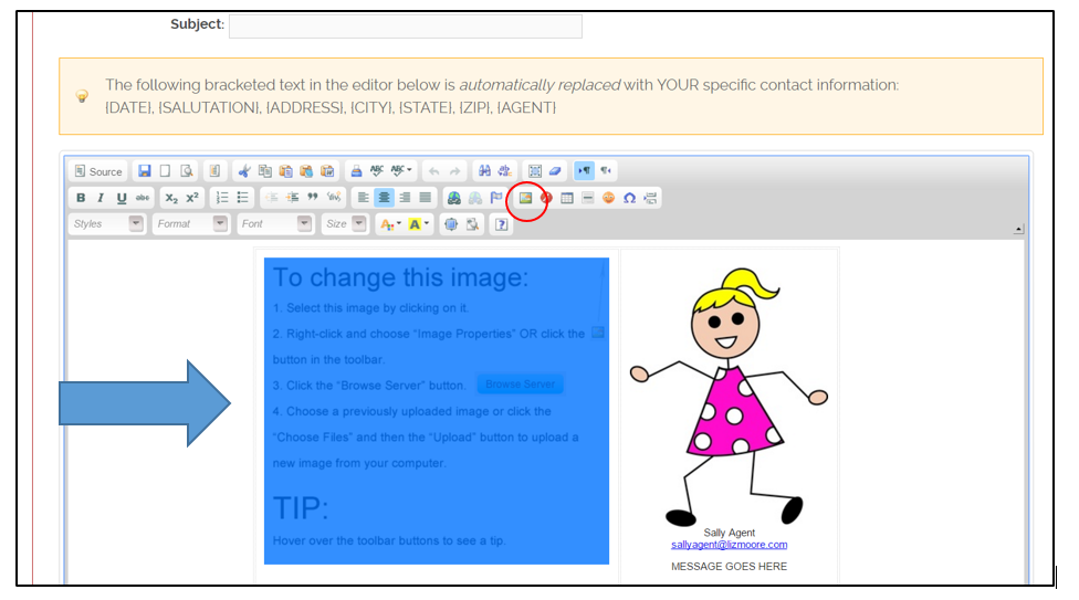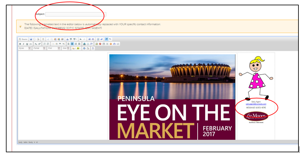 Next, you want to be sure to give your email a subject line, as well as add copy in the “Message Goes Here” field in the body of the email. You simply highlight and delete the “Message Goes Here” filler and type your own, or leave it blank. Your photo and contact info will automatically display.