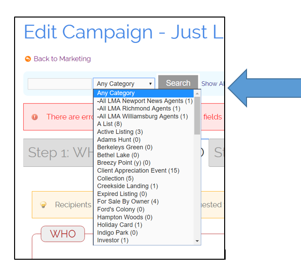 If you would like to send to everyone in your Connections, instead of selecting a category you would click Show All. Please keep in mind that Connections can only send to 300 recipients at one time.