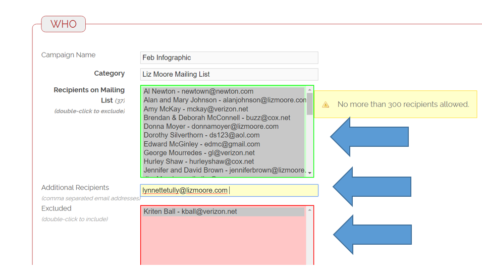 You can exclude people who are in the green box by double clicking on their name. That will move them to the Exclude box. You can also send to additional recipients at that time by typing their email address in the Additional Recipients box. They *do not* have to be in Connections for you to do this.