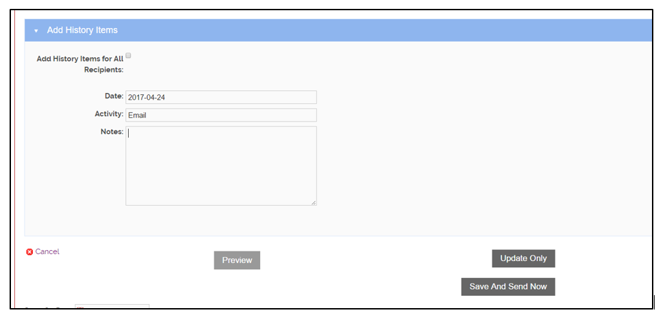 You can add a history item for the entire category you are sending to by clicking Add History Items, inserting the info and clicking “Update”.